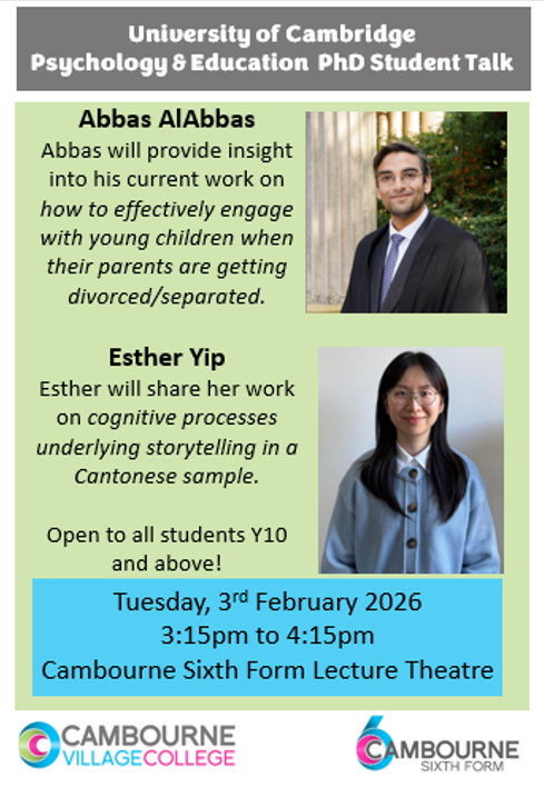 We are excited to welcome two University of Cambridge students who are doing a PhD in Psychology and Education. They will be discussing their research areas – Child Psychology and Cognitive Psychology. Any Y10-Y13 student who is currently studying Psychology or who is interested in studying the subject in the future is strongly recommended to attend. It is also open to anyone with a casual interest in the above topics or anyone who is keen to find out more about what studying at the University of Cambridge is like. Hope to see you there!