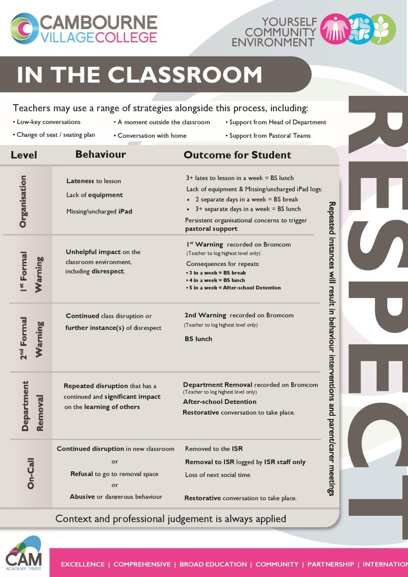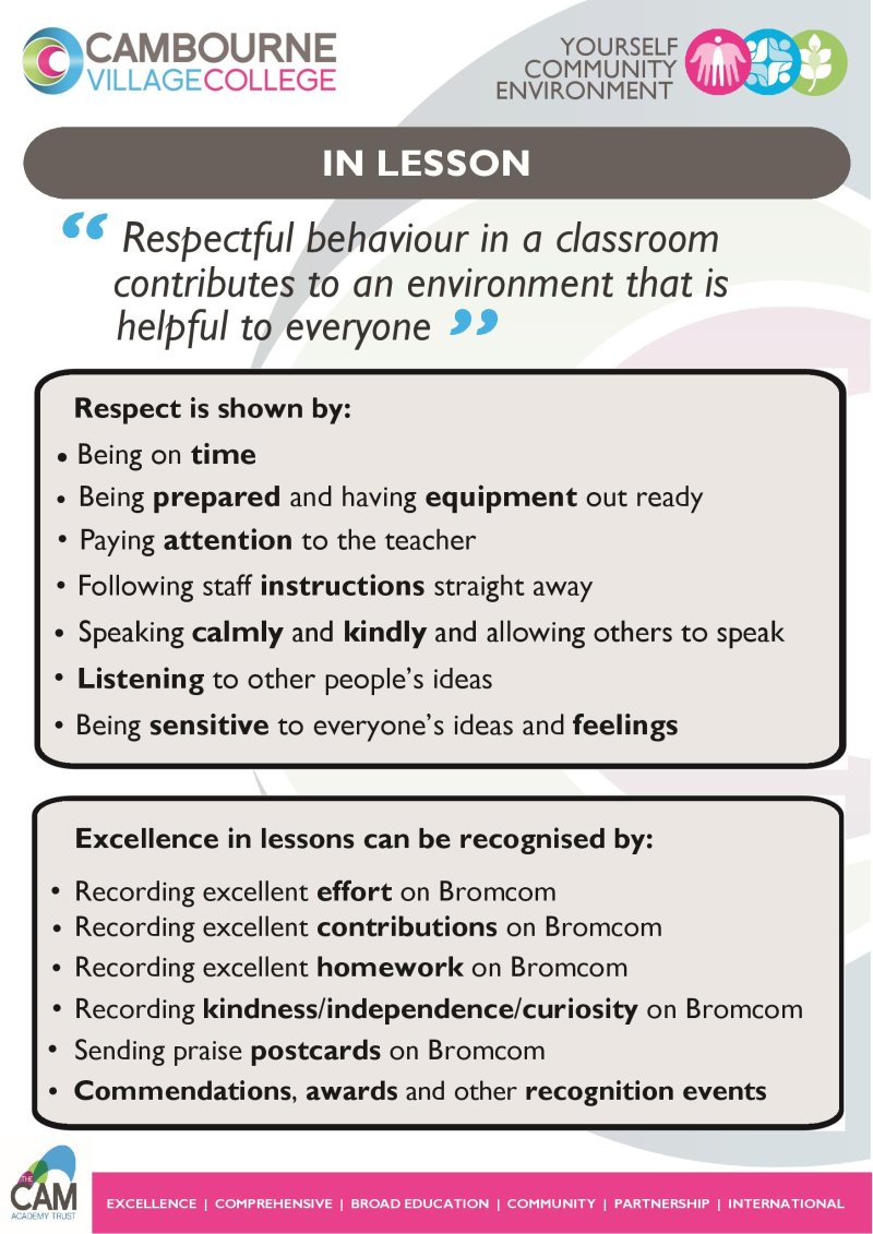 Schools are busy and dynamic places; expectations need to be understood so that we maintain an orderly environment where all pupils can feel safe and can succeed, especially in our constantly growing College. We aim to provide a balance between reward and consequence and to provide opportunities for all to be praised for their efforts and achievements. Our behaviour procedure is focused on supporting our 'Respect Value’ which was devised by pupils and based on the principles of respect.