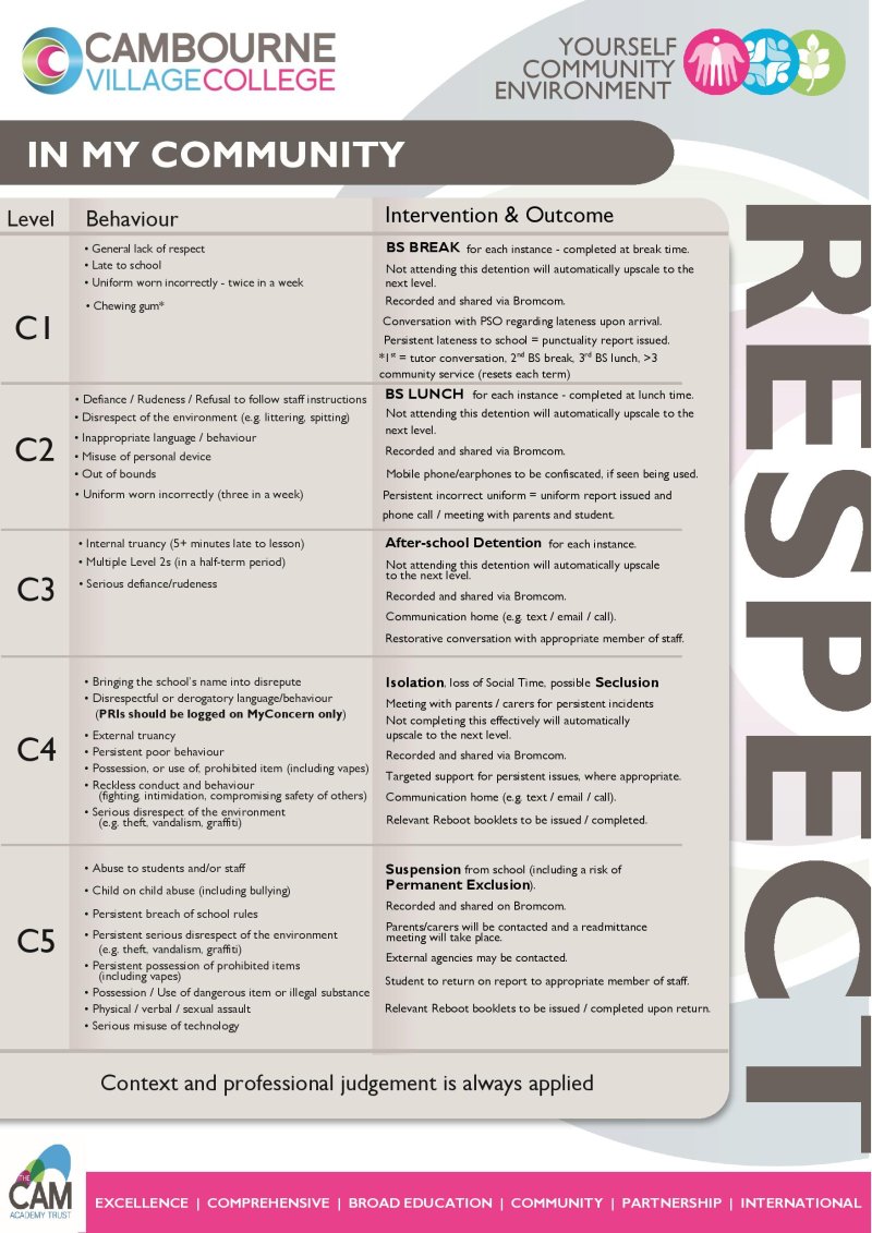 When pupils fail to meet expectations, an escalating scale of measures and consequences is employed to address and discourage inappropriate behaviour. The model has been designed to minimise the potential for the persistent disruption of learning by any individual. It makes clear that persistently impeding others’ learning, harming others or causing disruption to our school community, can ultimately lead to a pupil leaving the school.